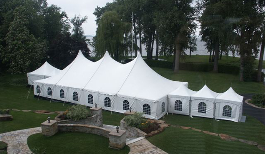 The marquees, commonly called “pole tents”, are erected through the placement of one or more center poles that serve to support the roof. The center posts are arranged vertically in the center of the marquees. It is precisely these posts that create the pretty gables of the marquee.