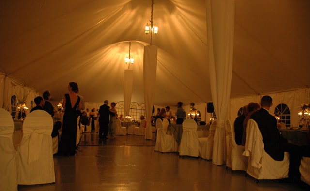 Pour le mariage à Saint-Lin, nous avons fait l’installation d’une tente 40 x 80 avec voilage au plafond (photo 1-2) ainsi que le plancher vernis.